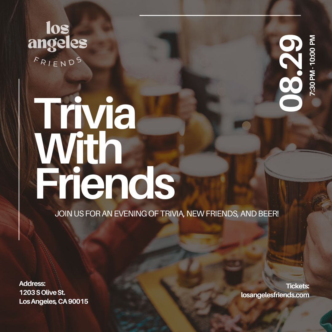 Ready to meet new friends and show off your random trivia knowledge? Join Los Angeles Friends at Audio Graph Beer Co! It's going to be a night of laughs, new friends, and all things popculture trivia. We’ll have 12 teams of 6—come solo or bring a buddy!
